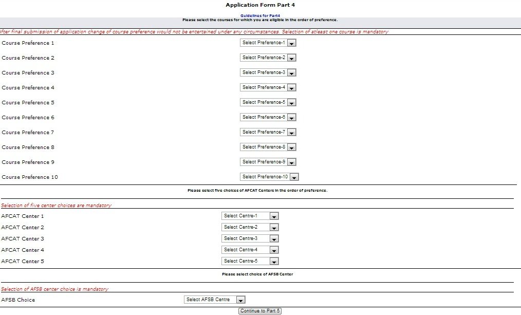 6. Here you can select course preference, AFCAT center (for written test) and AFSB center (for interview). Select as per your interest and proceed.