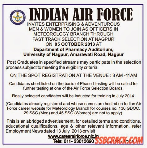 Indian Air Force Invites Enterprising and Adventurous ย Men & Women To Join As Officers In Meteorology Branch Through Fast Track Selection At Nagpur On 05 October 2013 At Department of Pharmacy Auditorium, ย University of Nagpur, Amarawati Road, Nagpur ย ON THE SPOT REGISTRATION AT THE VENUE : 8 AM-11AM.