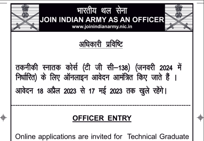 Male candidates are welcome to apply online for the Technical Graduate Course (TGC-138) starting in January 2024, as per the Short Notification released by the Indian Army. The application window will be open from April 18th to May 17th, 2023.