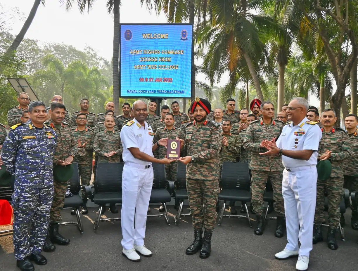 As part of the Naval & Industrial Tour of Higher Command Courseโ54, a delegation of 50 course officers led by Lt Gen Harjeet Singh Sahi, Commandant, Army War College (AWC), Mhow, visited the Eastern Naval Command from January 5 to 8, 2026.